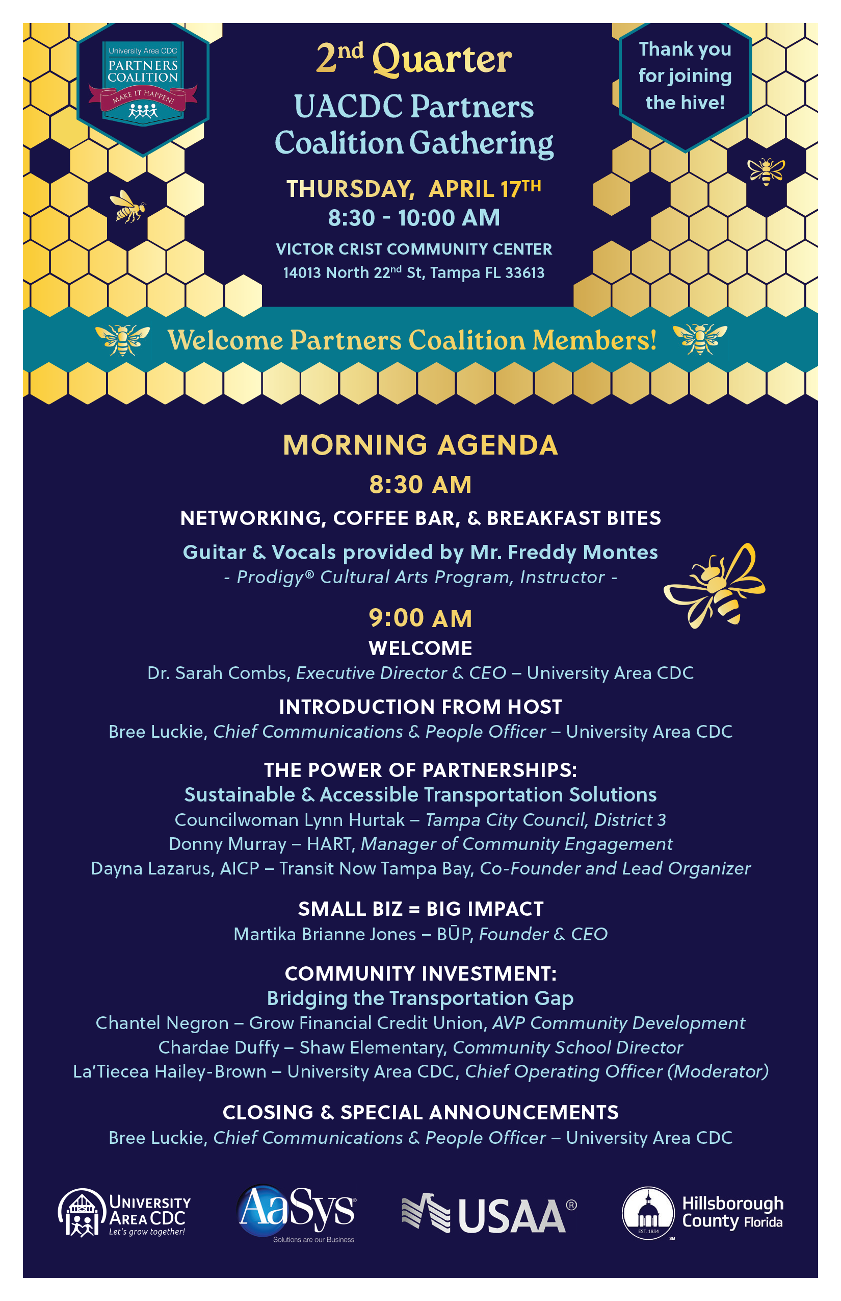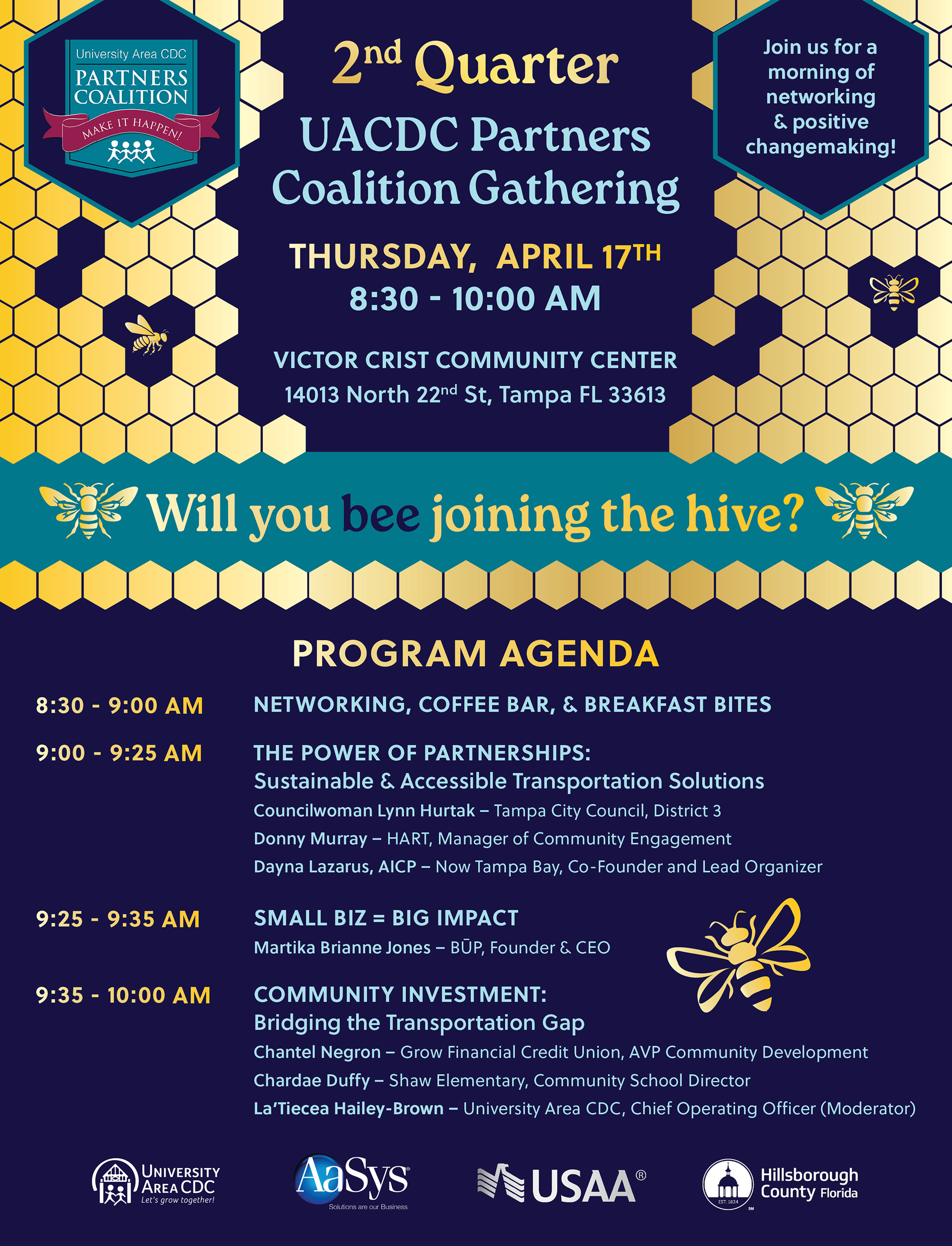 My work for University Area CDC, a nonprofit based in Tampa, FL, is showcased through various flyers, postcards, banners, brochures, and cohesive campaigns.